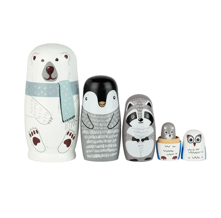 This printed wood traditional nesting animal doll set is a fun toy for kids that also makes a lovely addition to any holiday decor. A festive holiday spin on the traditional Matryoshka Russian nesting dolls.