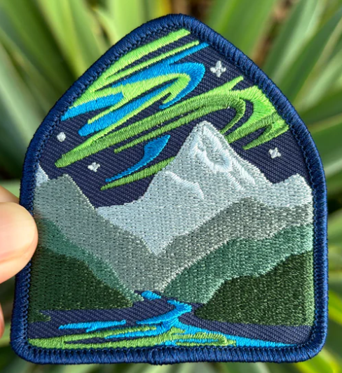 A dazzling display of the Northern Lights, seen over the coastal mountains and waterways. Measures 2.6” wide by 3” high.