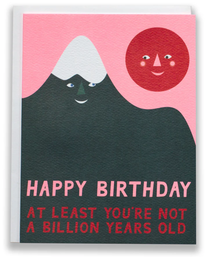 A red sun in a pastel neon pink sky giving sweet birthday comfort to a smiling mountain: At Least You’re Not a Billion Years Old!!!