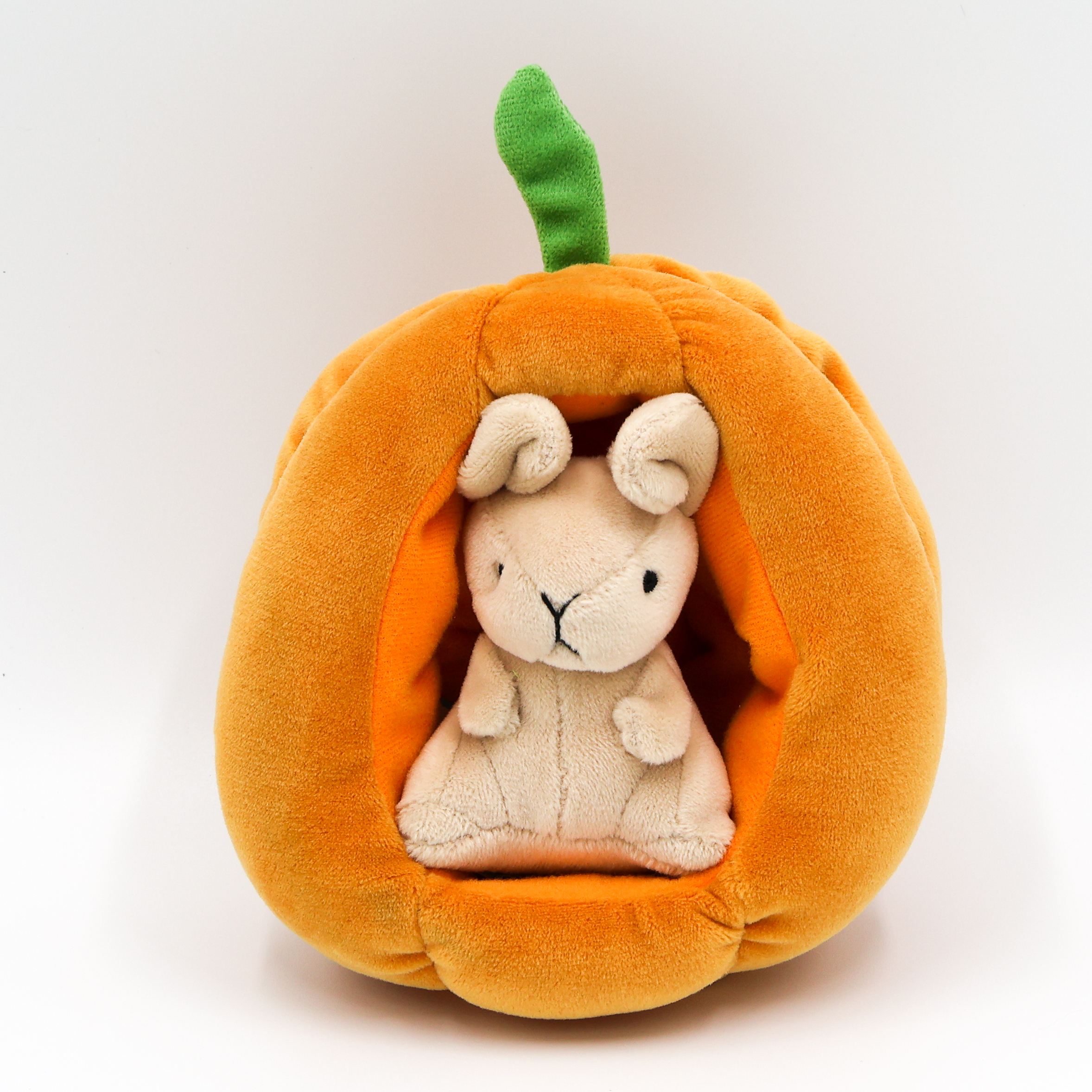 Shy little sweetheart Brambling Mouse has a podgy pumpkin for a house! This diddy darling has petal ears and the softest, stretchiest beigey fur. When this pal is tired, they curl up snug inside their bright orange home. With a gorgeous green stalk and squishy segments, it’s just the right size for mice!