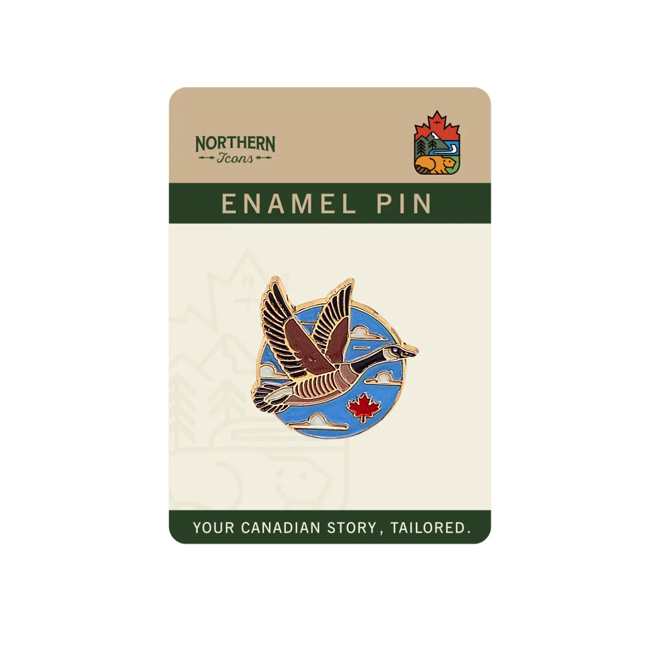 This enamel pin captures the elegance of the Canada goose in mid-flight, set against a blue sky dotted with soft clouds and a symbolic red maple leaf. The graceful pose and upward motion reflect freedom, endurance, and the spirit of Canadian wilderness. It’s a refined and meaningful design that resonates with nature lovers and proud Canadians alike.