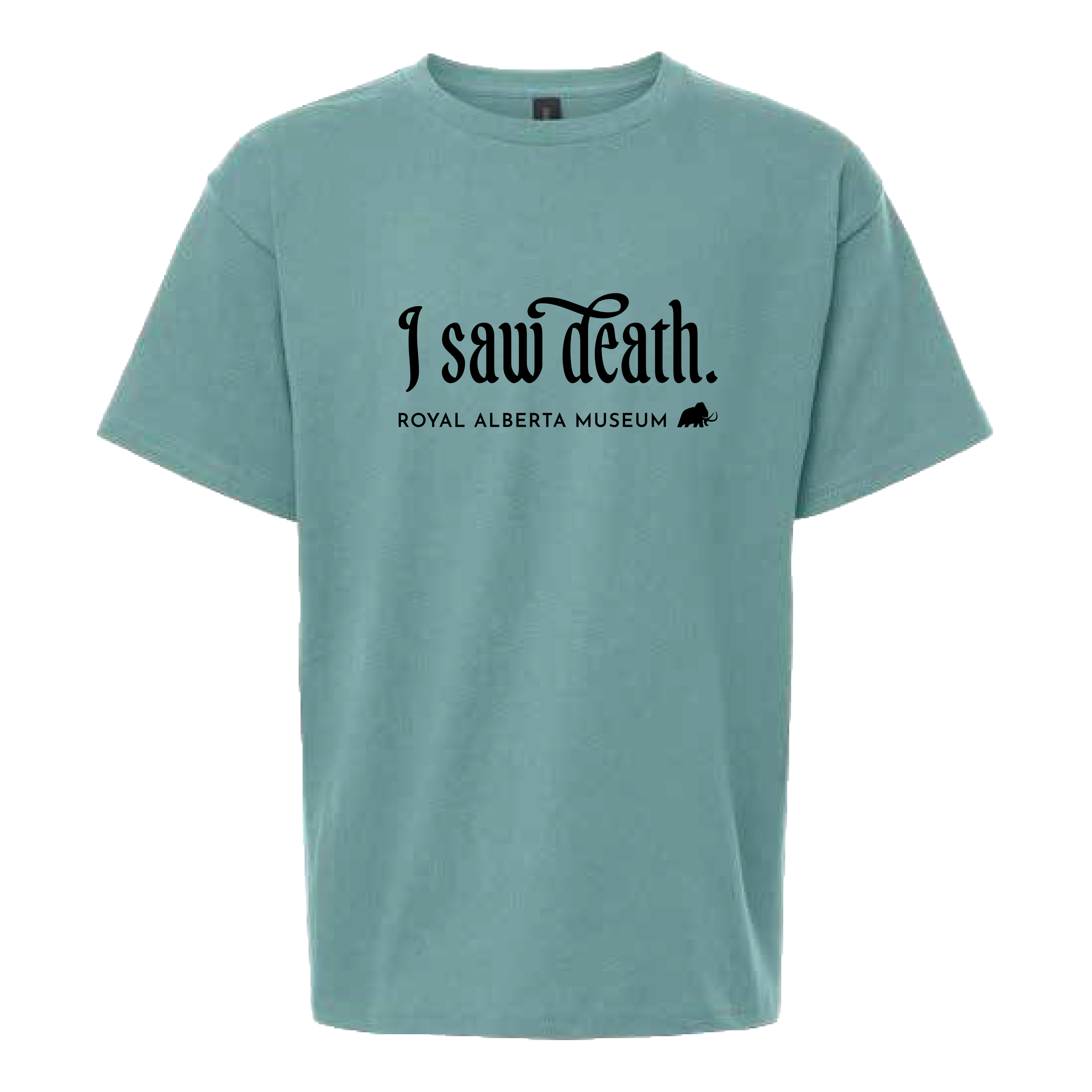 Aqua kid’s t-shirt featuring a skull motif created exclusively for the Royal Alberta Museum’s exhibition: Death: Life’s Greatest Mystery.