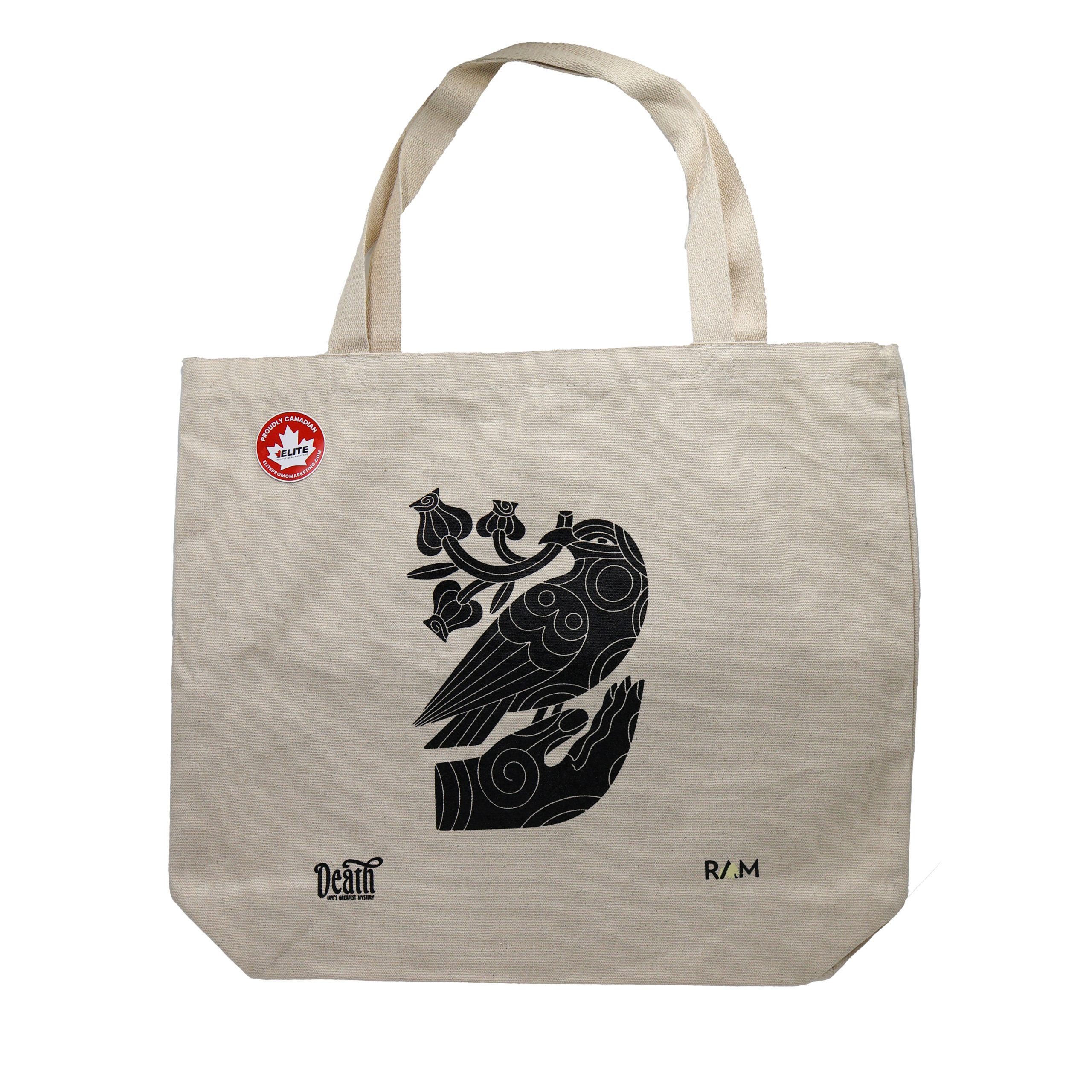 Tote bag featuring crow motif created exclusively for the Royal Alberta Museum’s exhibition: Death: Life’s Greatest Mystery.