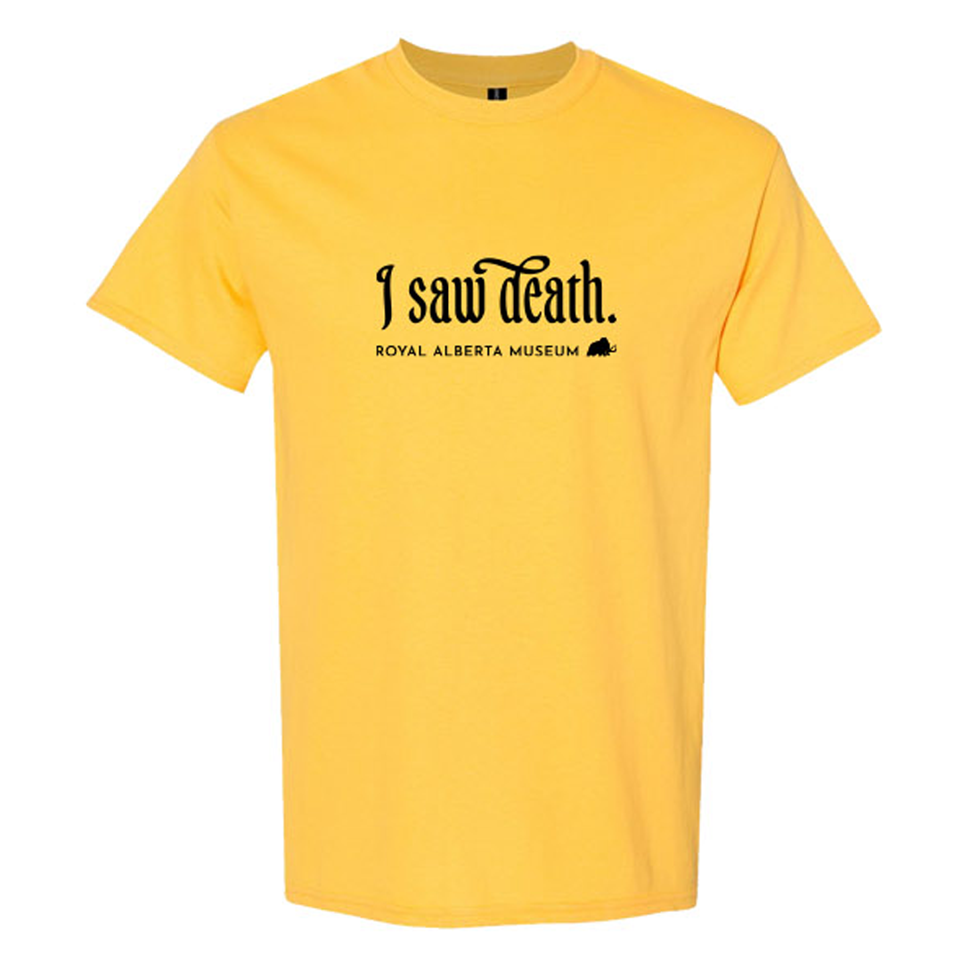 Yellow t-shirt featuring a bird in hand motif created exclusively for the Royal Alberta Museum’s exhibition: Death: Life’s Greatest Mystery.