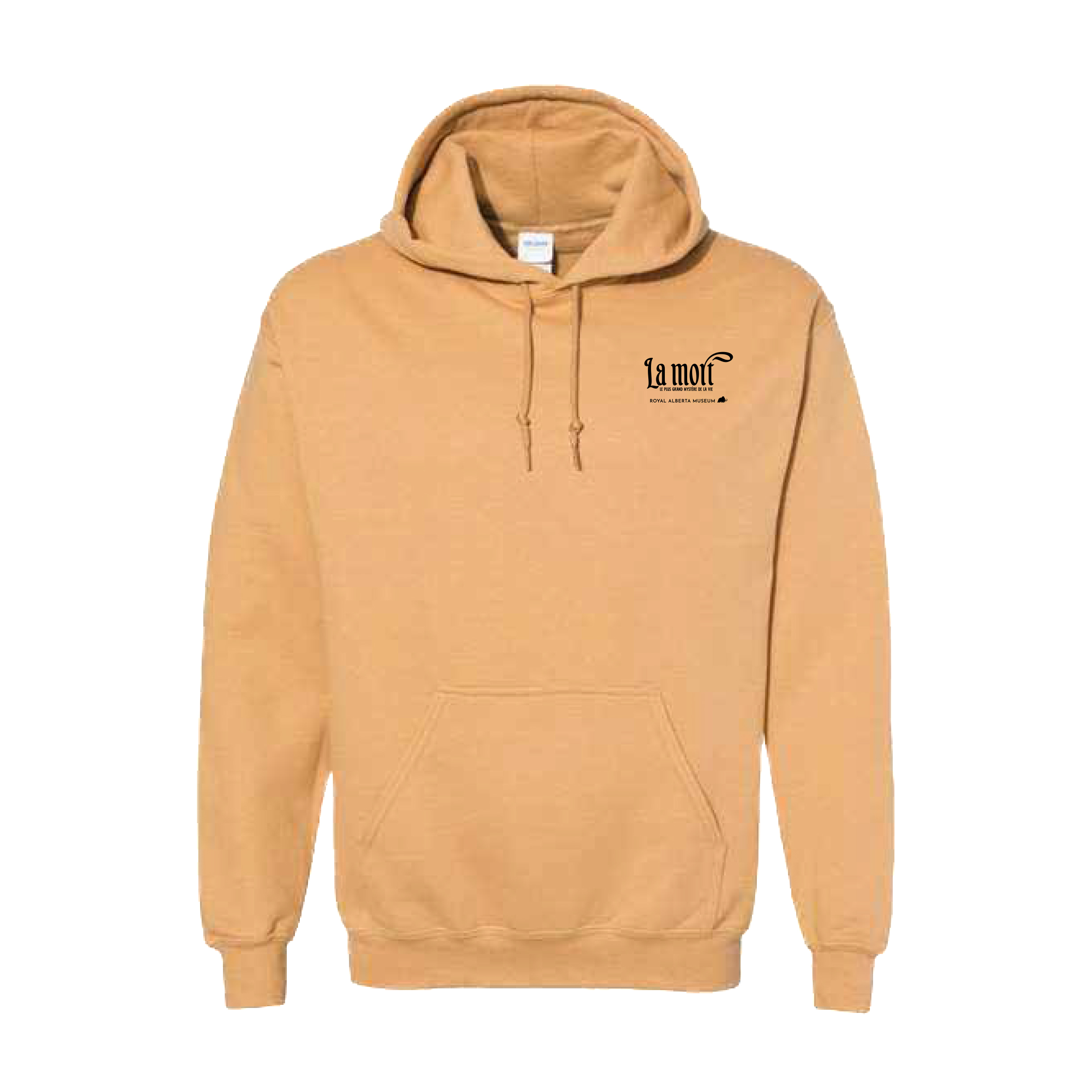 Gold hoodie featuring a bird in a hand motif created exclusively for the Royal Alberta Museum’s exhibition: Death: Life’s Greatest Mystery.