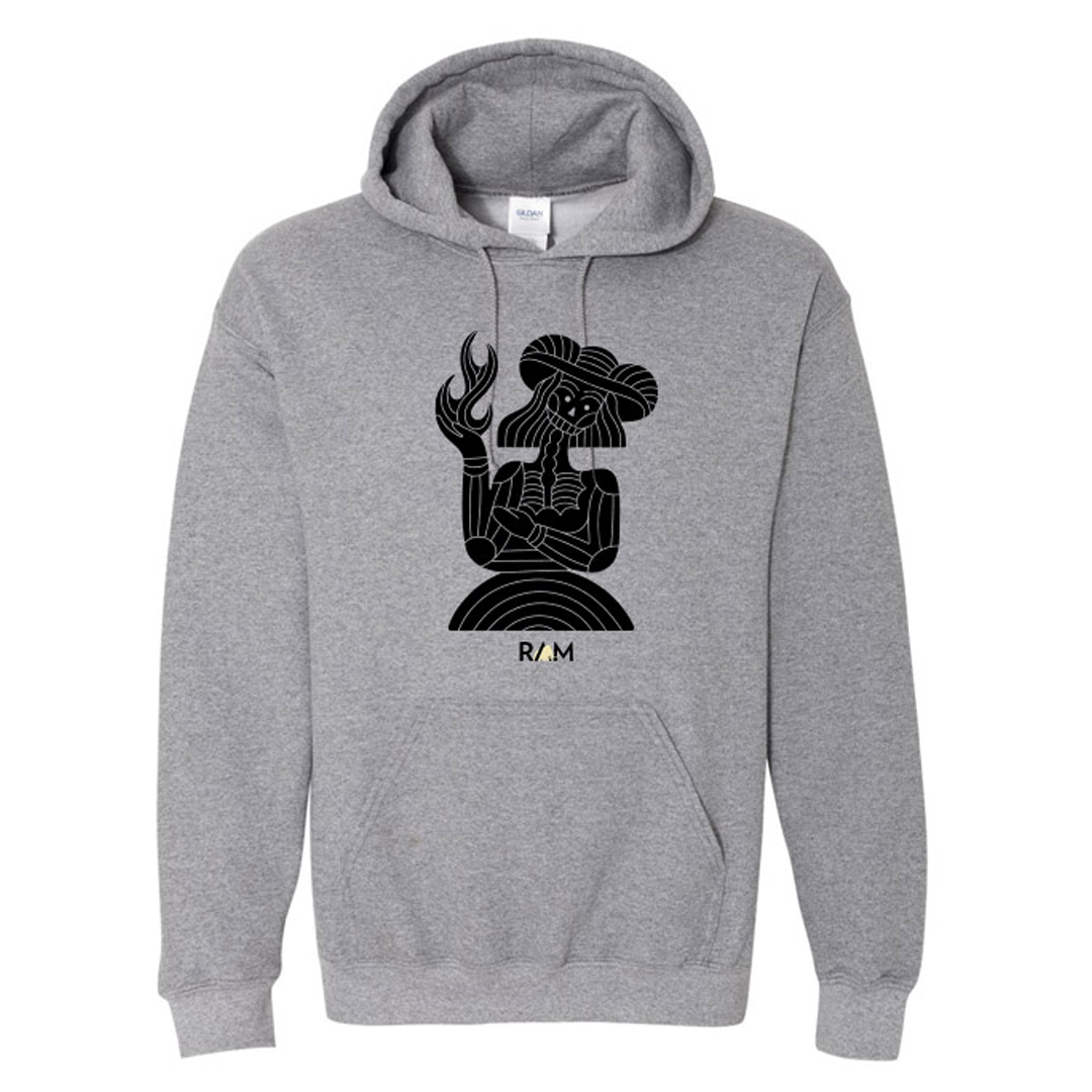 Grey hoodie featuring a Calaca motif created exclusively for the Royal Alberta Museum’s exhibition: Death: Life’s Greatest Mystery.