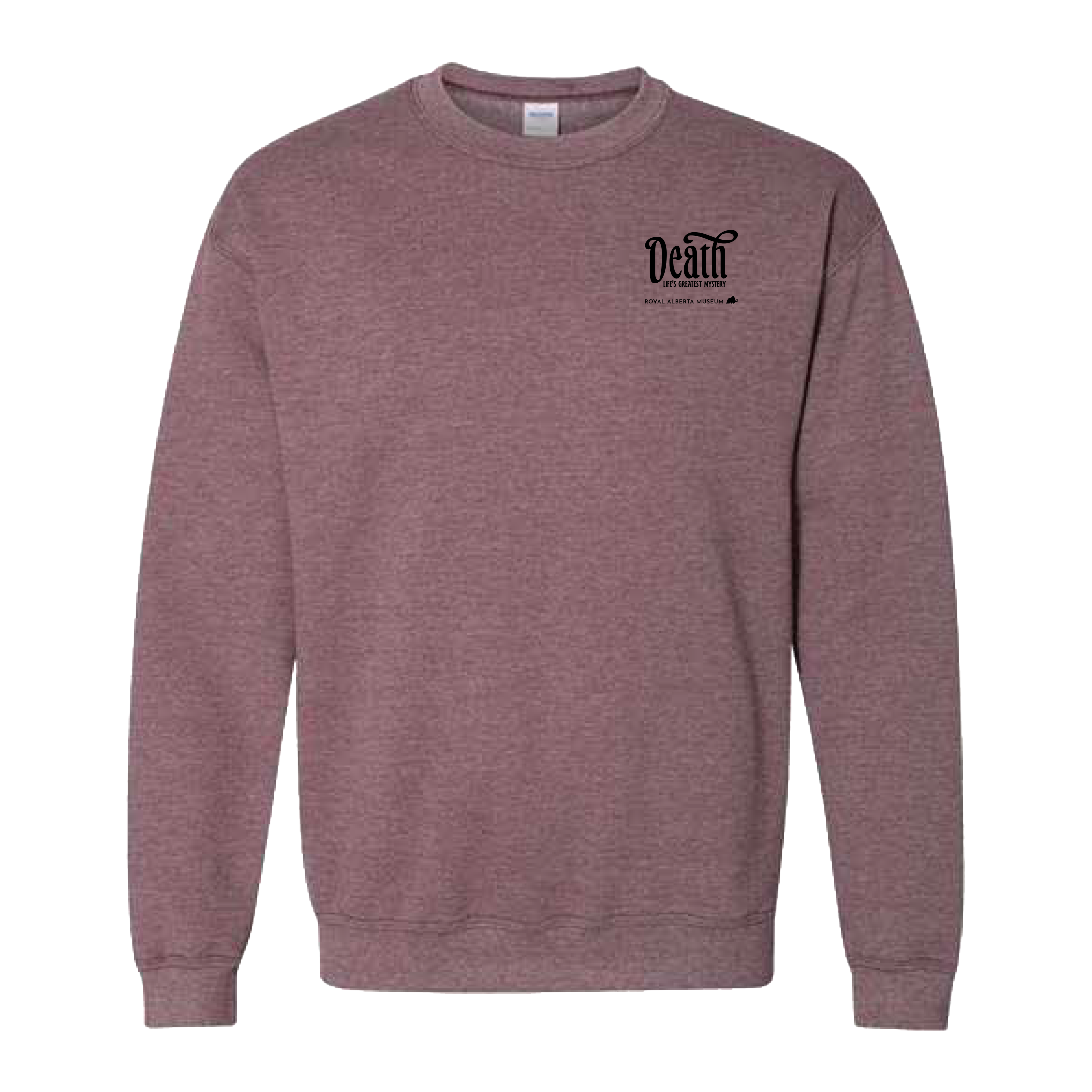 Maroon sweatshirt featuring a skull motif created exclusively for the Royal Alberta Museum’s exhibition: Death: Life’s Greatest Mystery.