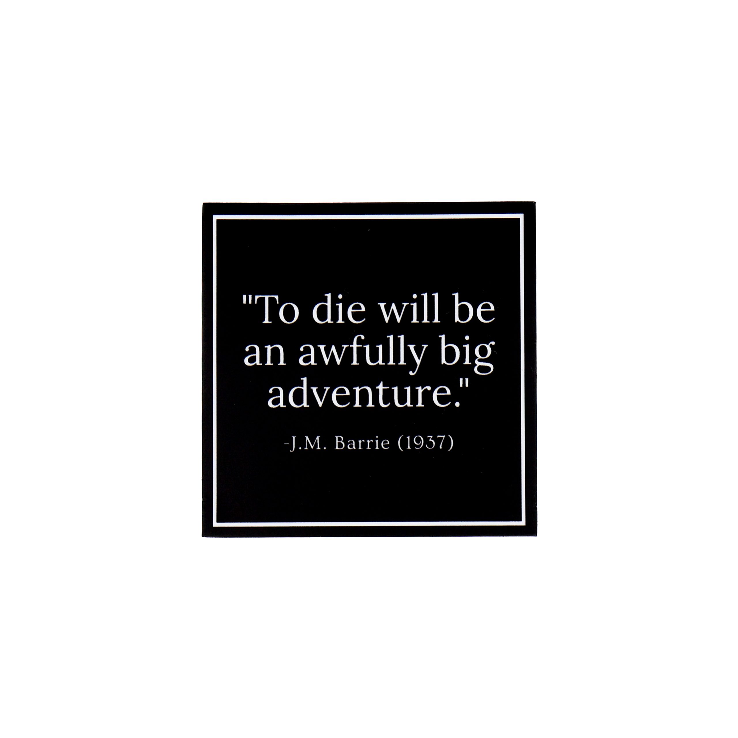 A sticker with a quote from J.M. Barrie about death: “To die will be an awfully big adventure”.