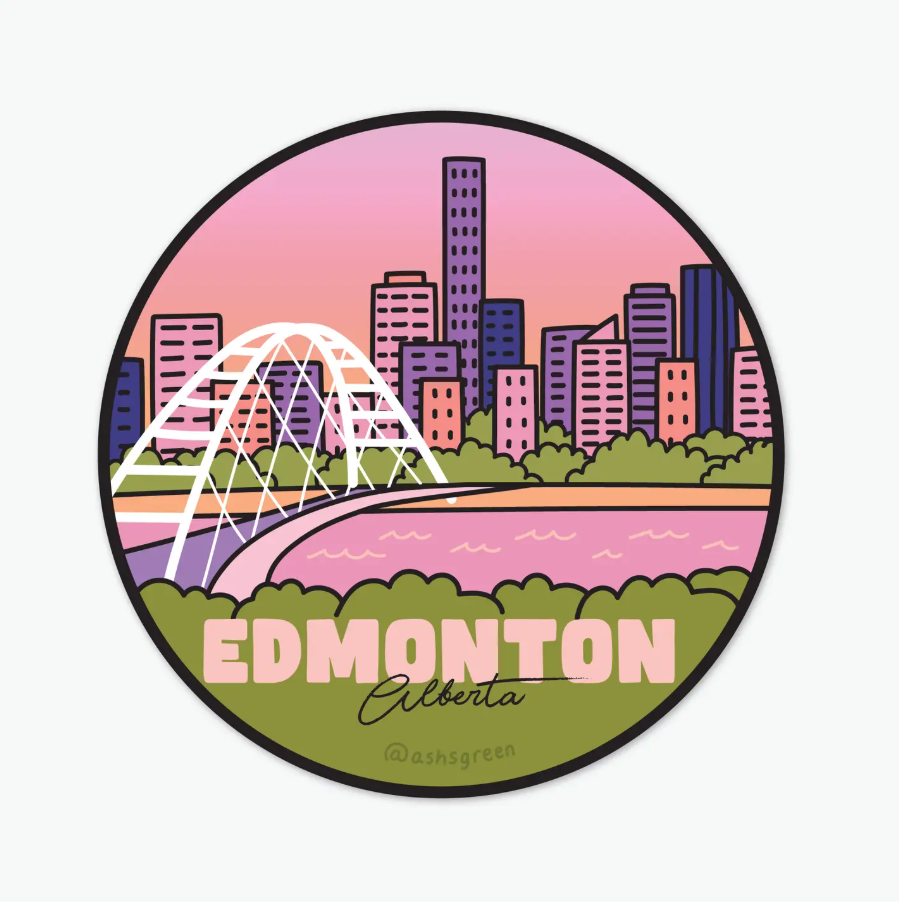 Edmonton, Alberta! Featuring the iconic Walterdale Bridge crossing the North Saskatchewan River with the downtown skyline behind.