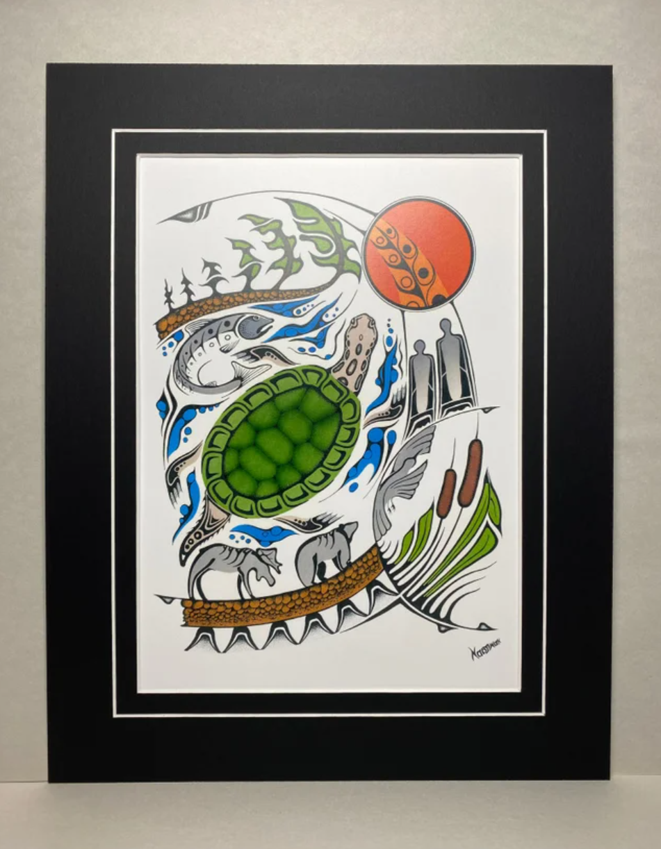 Among the principle Dodems (clans) of the Anisihnaabek are the members of the Fish Clan, who are said to be teachers possessing knowledge of the world that needs to be imparted to others. However, as fish are relegated to the realms of water, they are in need of one who can carry their teachings to others. This special role falls to Turtle (Makkinak), chief figure among the fish clans, who is able to dwell both below the waters and upon the land. As such, Turtle is said to be a communicator, possessing the ability to speak the languages of all beings who dwell upon Mother Earth — those of the waters, land and air – and therefore acts as an emissary for all.