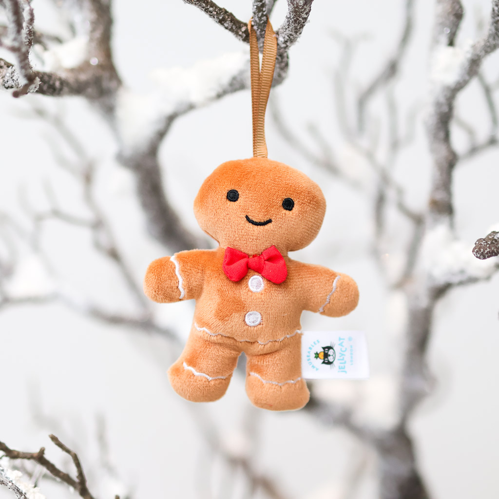 Festive Folly Gingerbread Fred is a dapper addition to your Christmas decor! With soft ginger fur, embroidered icing cuffs and buttons, a red bow tie and toffee ribbon loop, this smiley guy has impeccable style!