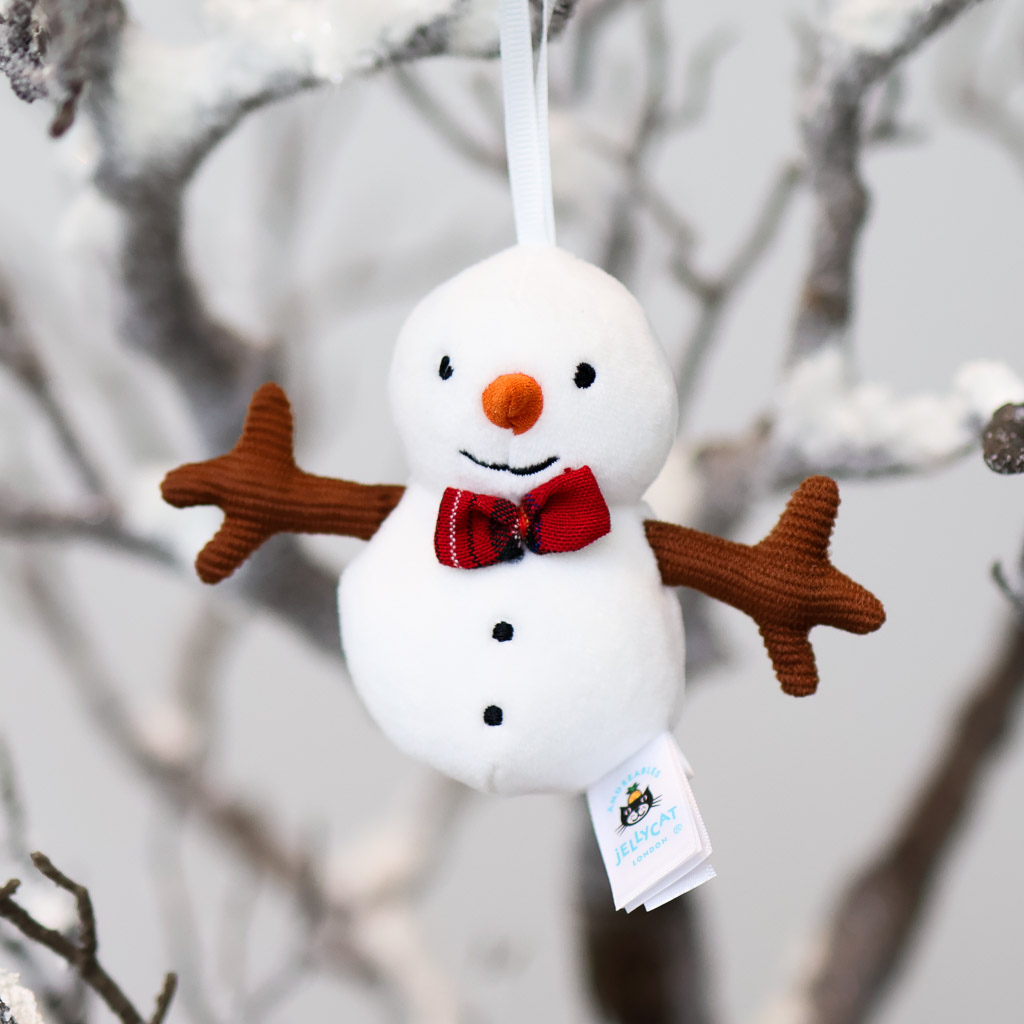 Festive Folly Snowman is marshmallow-soft in gentle cream fur. This playful tree pal has a tartan bow-tie, stitched coal buttons and suedette carrot nose. With a snowy ribbon for hanging on the tree and chocolate cord arms held wide for hugs, this snowman is anything but frosty!