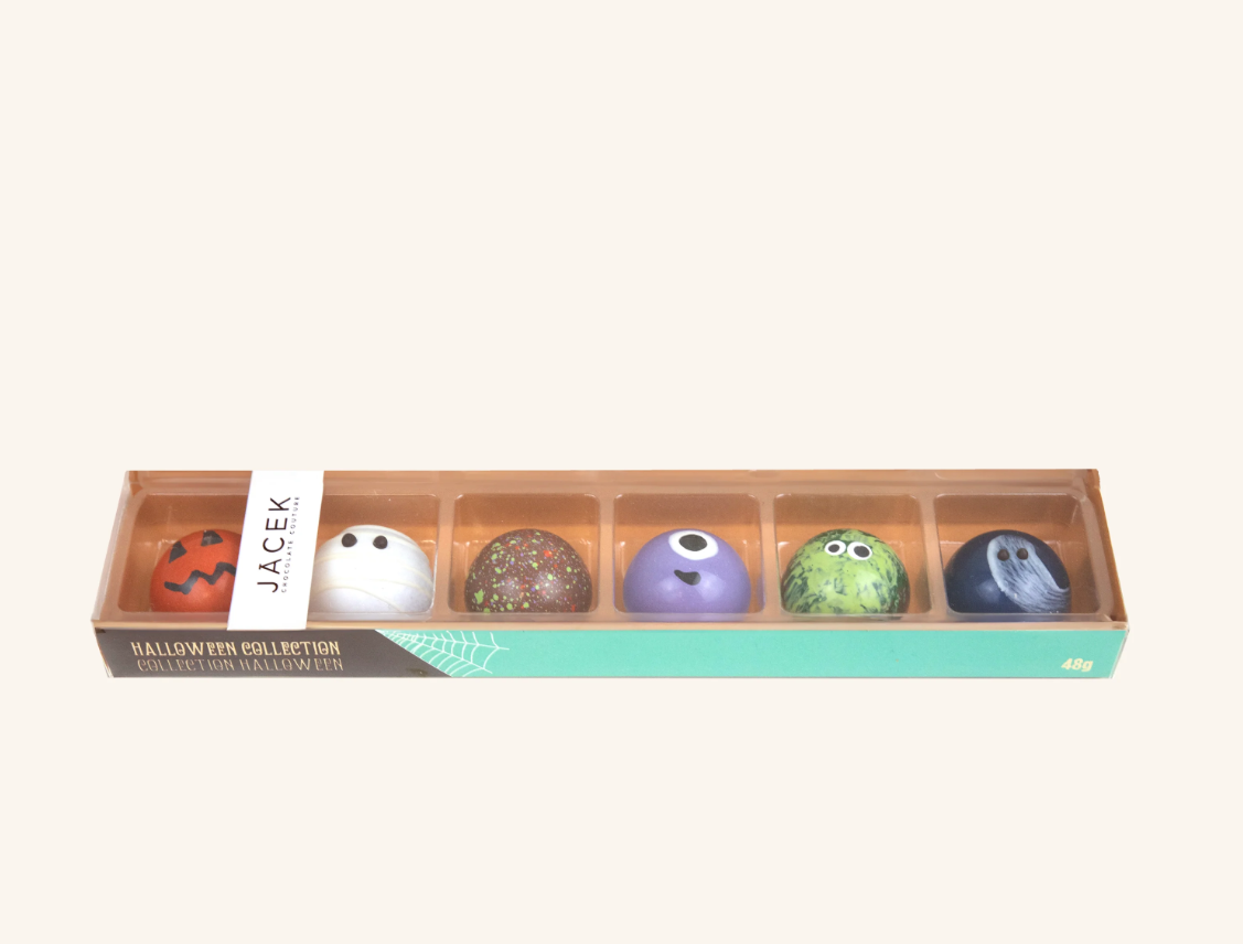 A 6-piece box of caramelized milk chocolate bonbons with each handcrafted bonbon intricately decorated in Halloween-inspired themes.