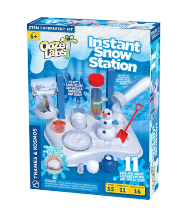 Set up your snow station — the headquarters for all your instant snow experiments, complete with the tools you’ll need for a snow-filled time, including beakers, test tube, petri dish, shovel, snow sifter, and snow globe dome. Then conduct more than ten science experiments with instant snow: make snowmen, a snow globe, colorful snow, snowballs, and more. There’s even a special snow sifter to create a magical snowfall! Learn about super-absorbent polymers and their scientific properties as you create your own winter wonderland.