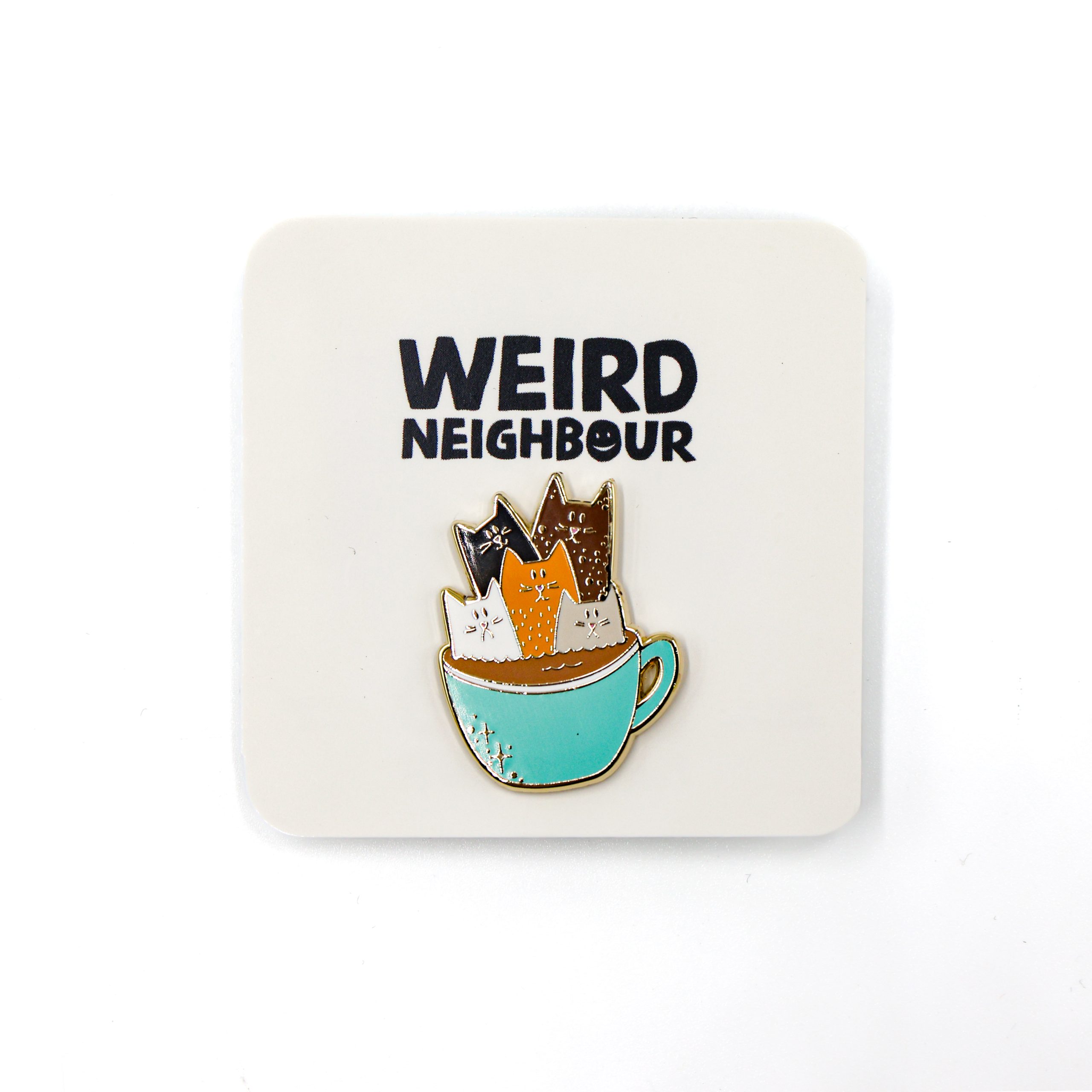 Kitty coffee pin by weird Neighbour featuring 5 cats bathing in a mug of coffee.