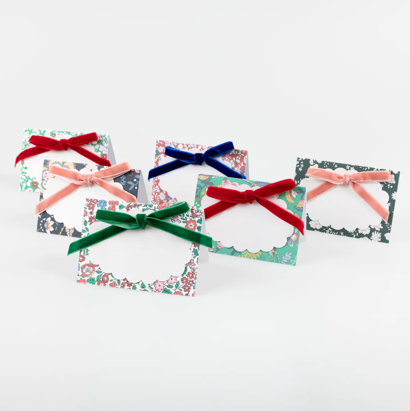 These paper place cards, featuring floral Liberty prints and soft velvet bows in a joyful festive palette, create a sophisticated tablescape with a touch of timeless charm. Pale matte gold foil accents and scalloped paper tags for personalization, bring a chic touch. A perfect conversation starter as guests find their seats! Additionally, there are extra tags included, so you can reuse these cards again and again throughout the season and beyond.
