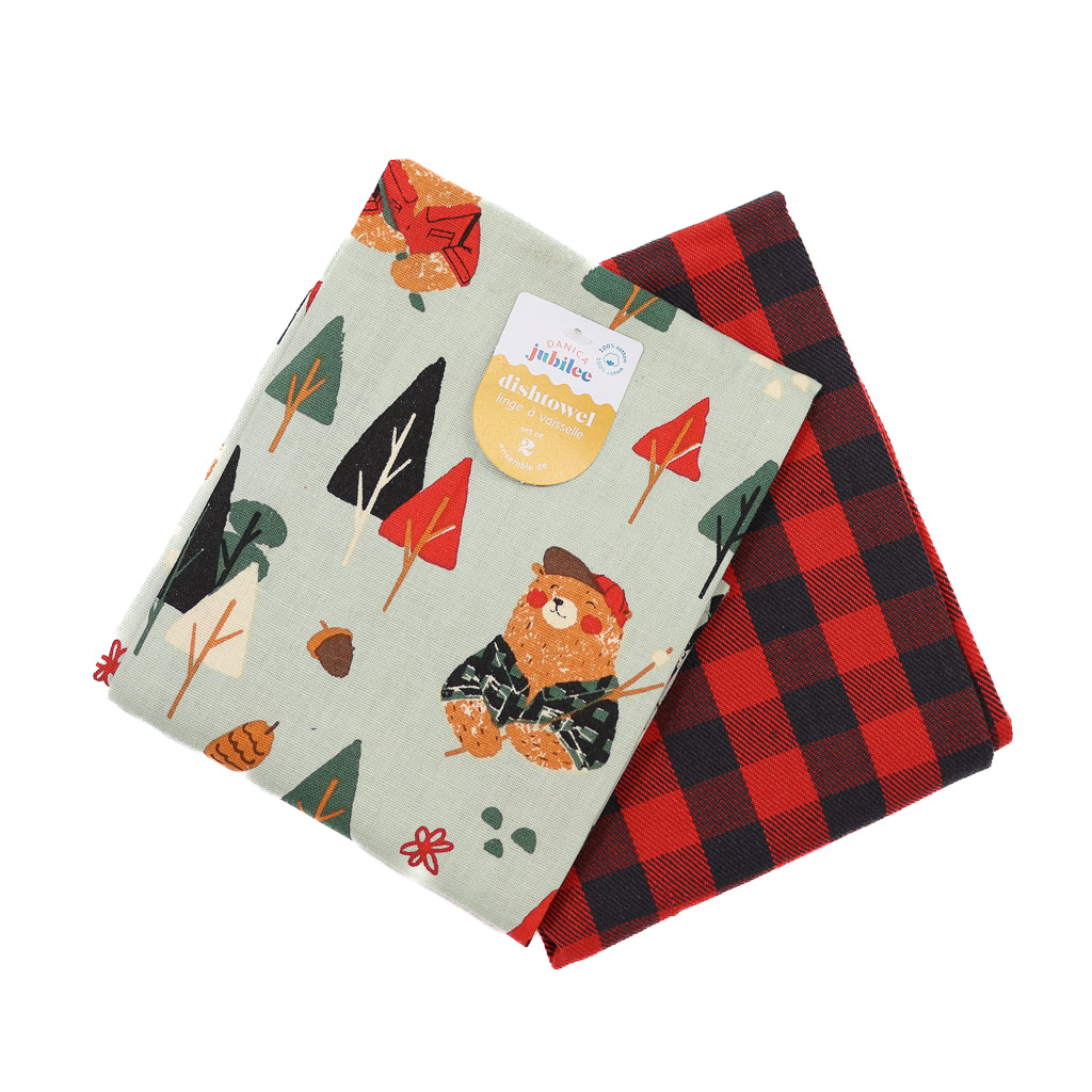 Catch some positive vibes and mark celebratory moments with the “Lumbearjack” tea towel set featuring unique holiday-themed embellishments.