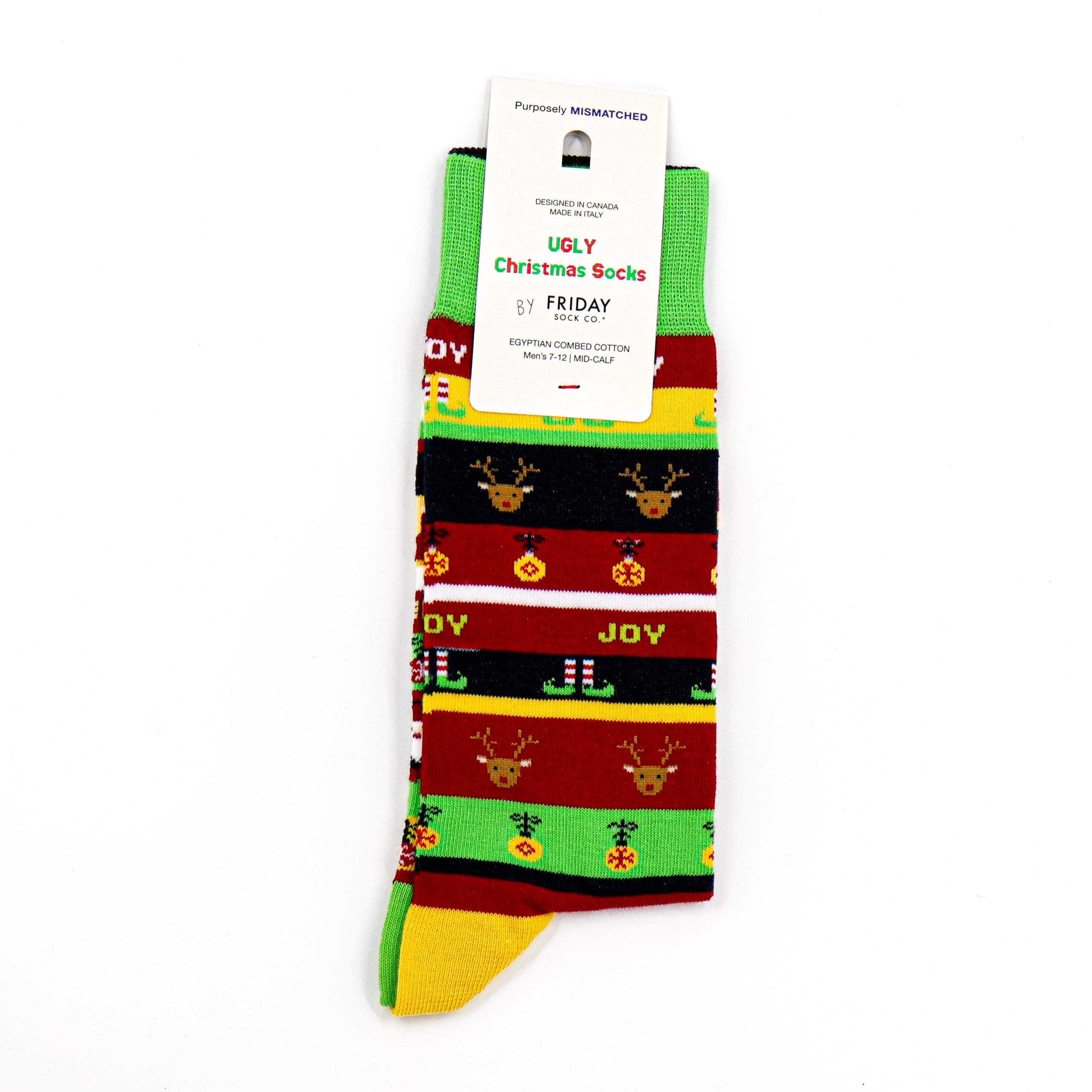 Look great from head to mistle-toe in these Mismatched Ugly Christmas Merry & Joy Socks!
