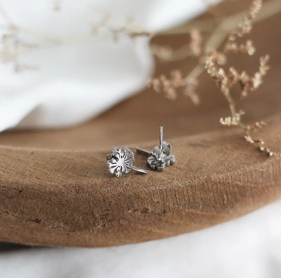 A minimalist pair of stainless steel studs featuring a dandelion design.