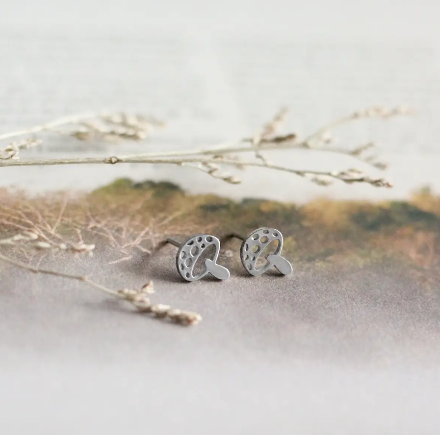 A minimalist pair of stainless steel studs featuring a mushroom design.