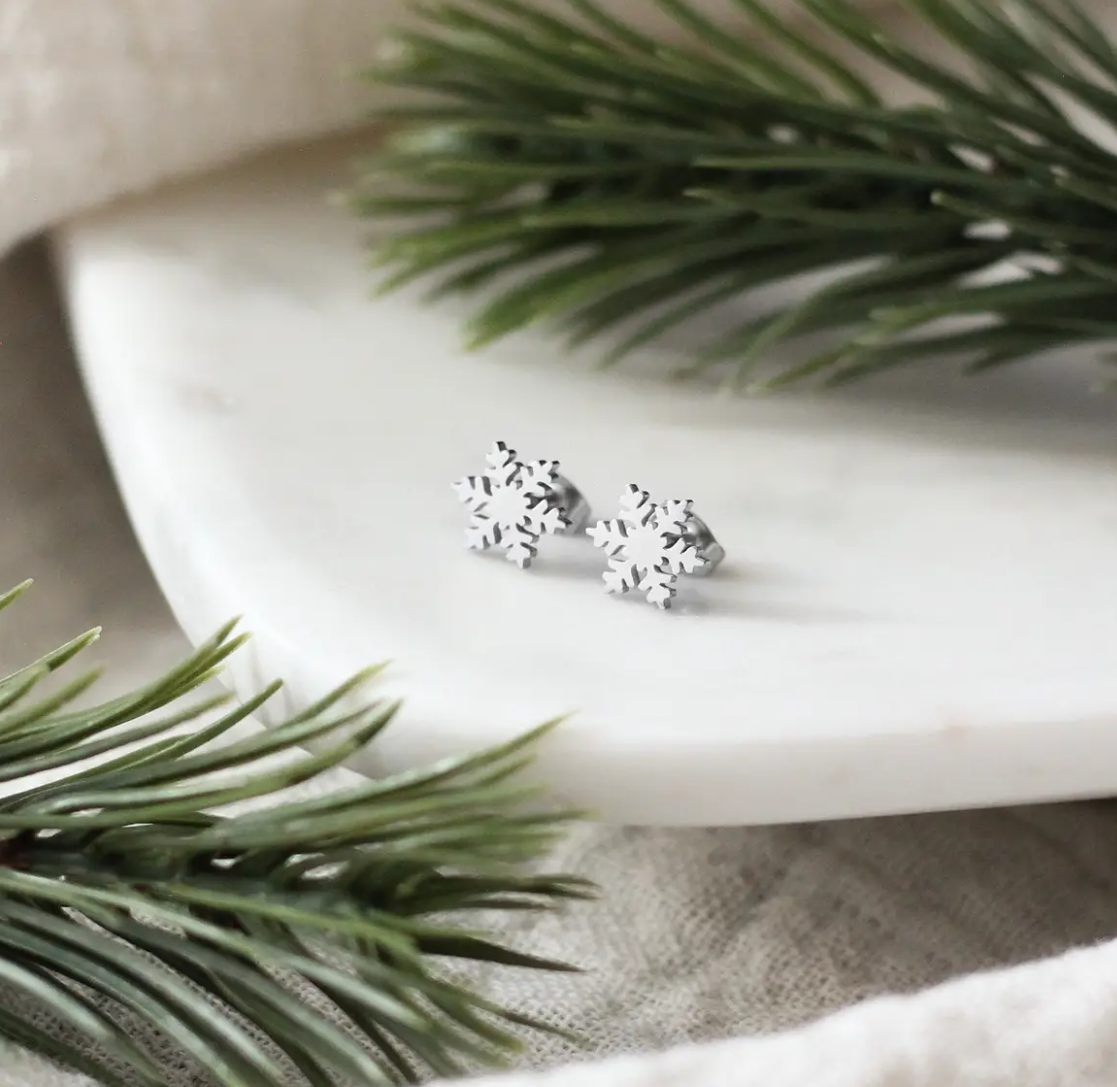 A minimalist pair of stainless steel studs featuring a snowflake design.