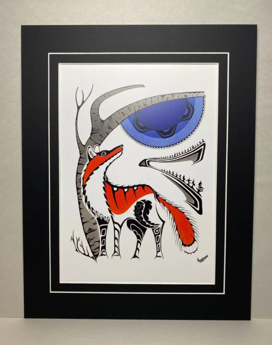 Moonlight Forager II is a reprise of a similar piece that the artist did over 30 years ago. Now long lost, that early drawing has remained a favourite and one that Mark has always wanted to artistically revisit in his now much more developed style and technique. Waagosh, as Fox is known to the Anishinabek People, continues to have a special significance in Mark’s life as he is frequently visited by Waagosh — more than any other forest dweller – during his travels whether travelling on foot, by paddle or by road. But there is an even more sacred and special presence of this keen, swift and adaptable animal in Mark’s life by way of his son whose Anishnabek name is Waagoshonse, “Little Fox.” This piece is dedicated to him.