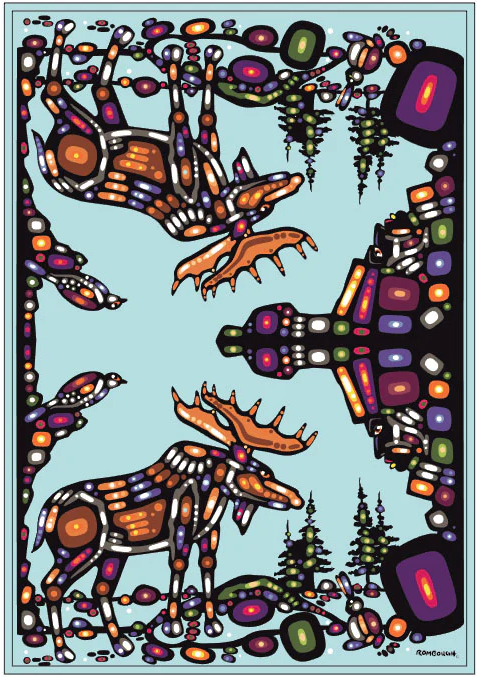 “Standing proud, he is the distance walker of the land and a swimmer from island to island. As the ancestors watch over the land and caring for all living things, the spirit rocks shine their colours.” – John Rombough