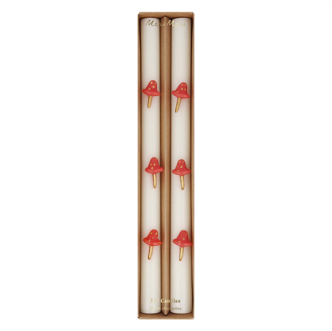 Red wax mushrooms, with hand painted gold ink spots and stems, are attached to the candles
