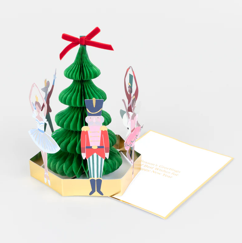 Why send a regular Christmas card, when you can gift one which transforms into a decorated 3D keepsake? Picture the joy when the recipient opens the envelope to discover the magic of the Nutcracker ballet! Classic Christmas colors meet modern pops of pink and shiny gold foil. Pretty embellishments include a honeycomb tree topped with a deluxe red velvet bow and pink tissue paper wings on the Sugar Plum Fairy. A standout way to spread holiday cheer.