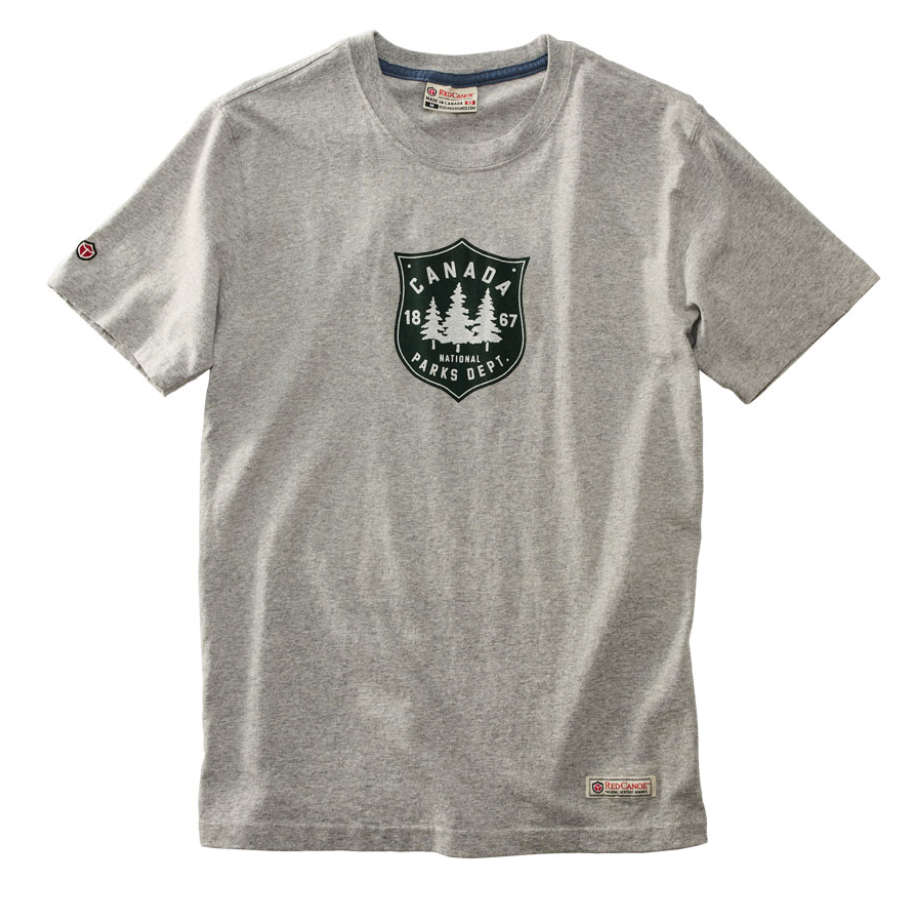 These wild places, located in every province and territory, range from mountains and plains, to boreal forests and tundra, to lakes and glaciers, and much more. The Parks Tee in this signature grey colourway features features a Canada Parks Dept. Logo in Forest Green.