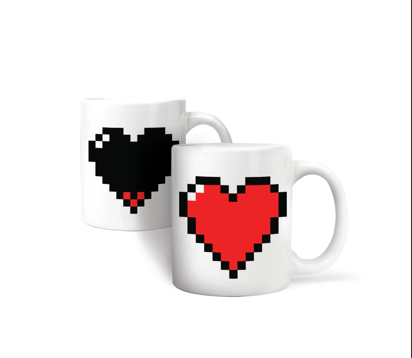 This unique 11-ounce ceramic heart mug reacts to heat, revealing new and fun graphics. This color changing mug will keep your favorite beverage toasty warm!