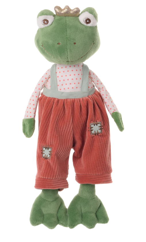 Leap for joy over our latest royal plush pal, Prince. Your child will delight in the company of this new frog friend, dressed in a charming polka-dotted shirt and red corduroy overalls adorned with intricate patchwork details. Completing his regal ensemble, Prince proudly wears a shiny golden crown on his head, ready for all of his princely adventures.