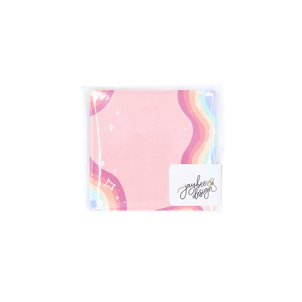 Remind yourself with rainbows! These square sticky notes feature a beautiful rainbow design on a pink background.