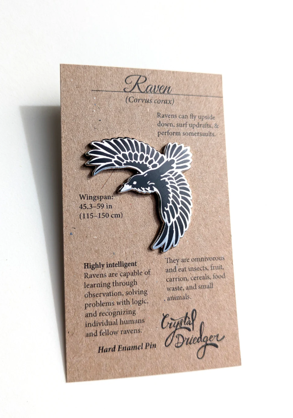 Each pin is backed with a black rubber clutch and carefully packaged for safe shipping. Pins are placed in a biodegradable glassine envelope and mounted on a recycled kraft paper backing card filled with bird facts.
