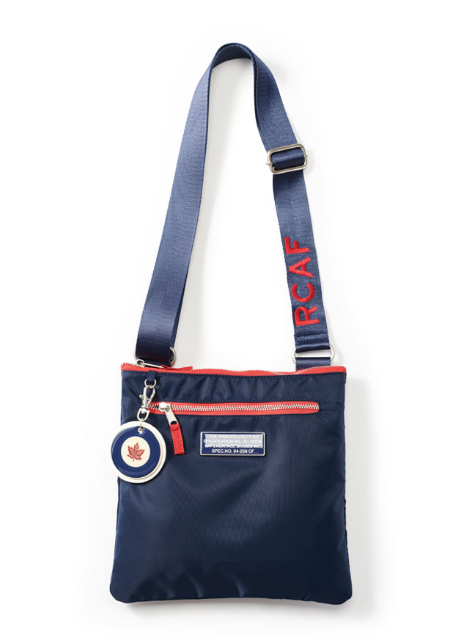 Top zip closure with one large exterior pocket and one small interior pocket. Includes a removable RCAF keyring.