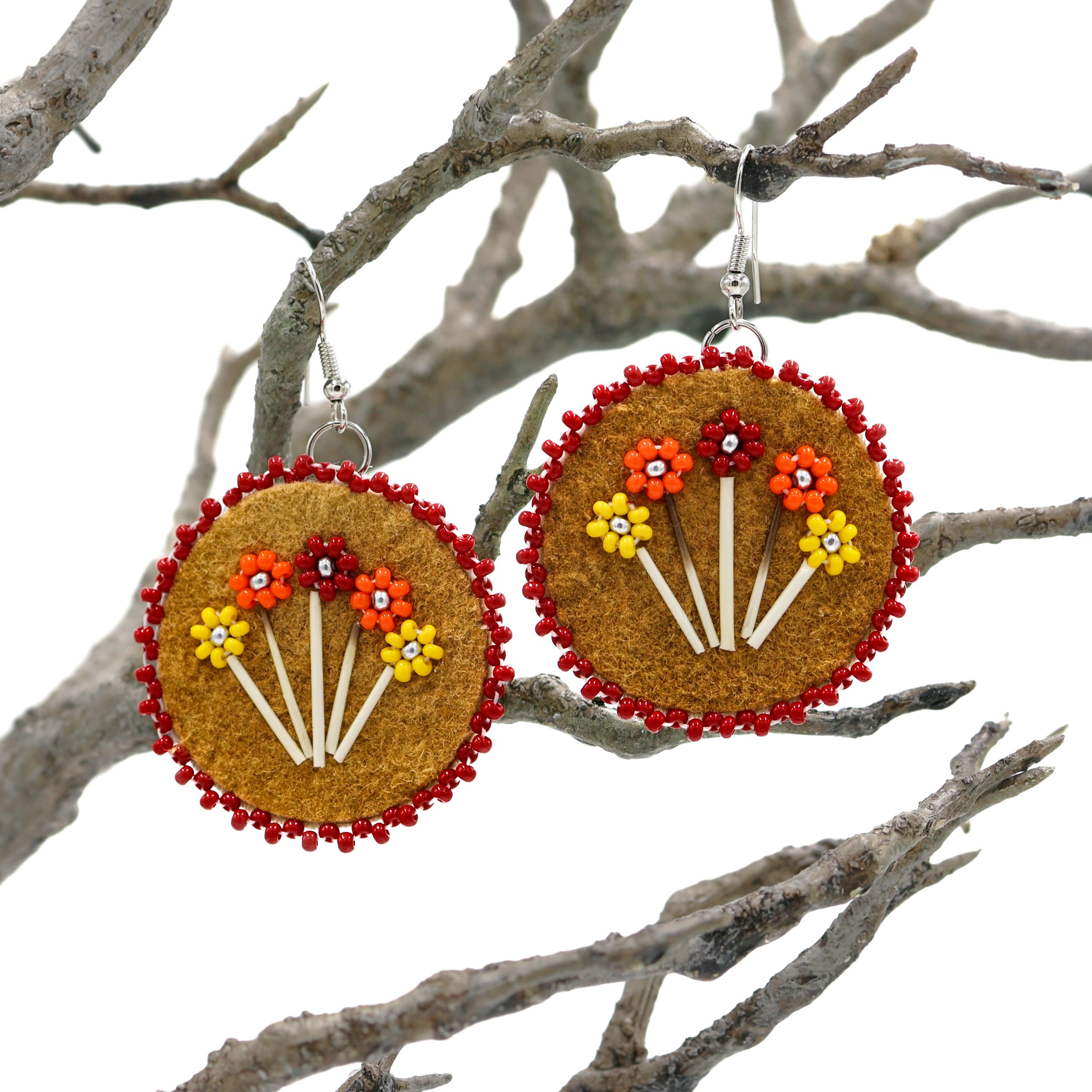 These earrings are composed of moose hide and porcupine quills, they are designed and created by Tanya Rushton.