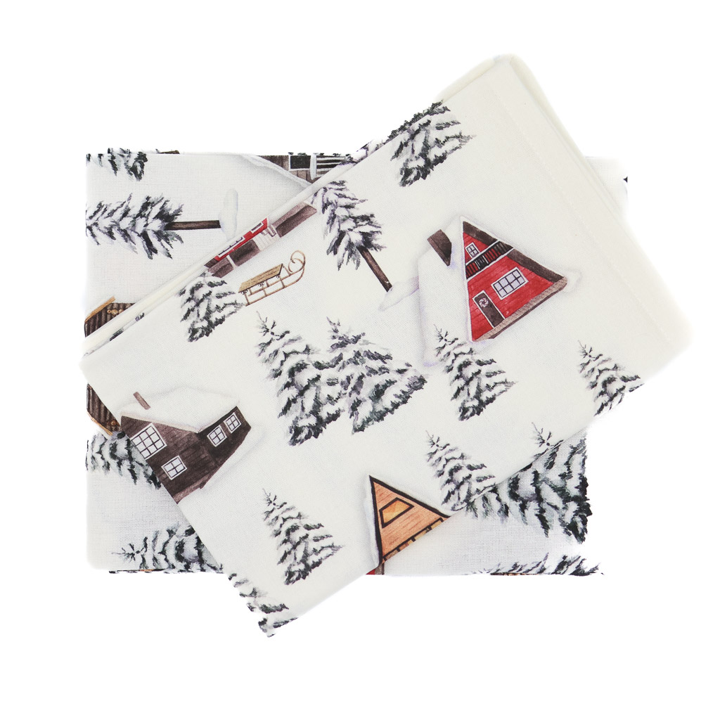 Crafted out of cotton, this white tea towel features a rustic assortment of graphic-style winter cabins amidst snowy trees for a wonderfully wintry complement to your kitchen décor.