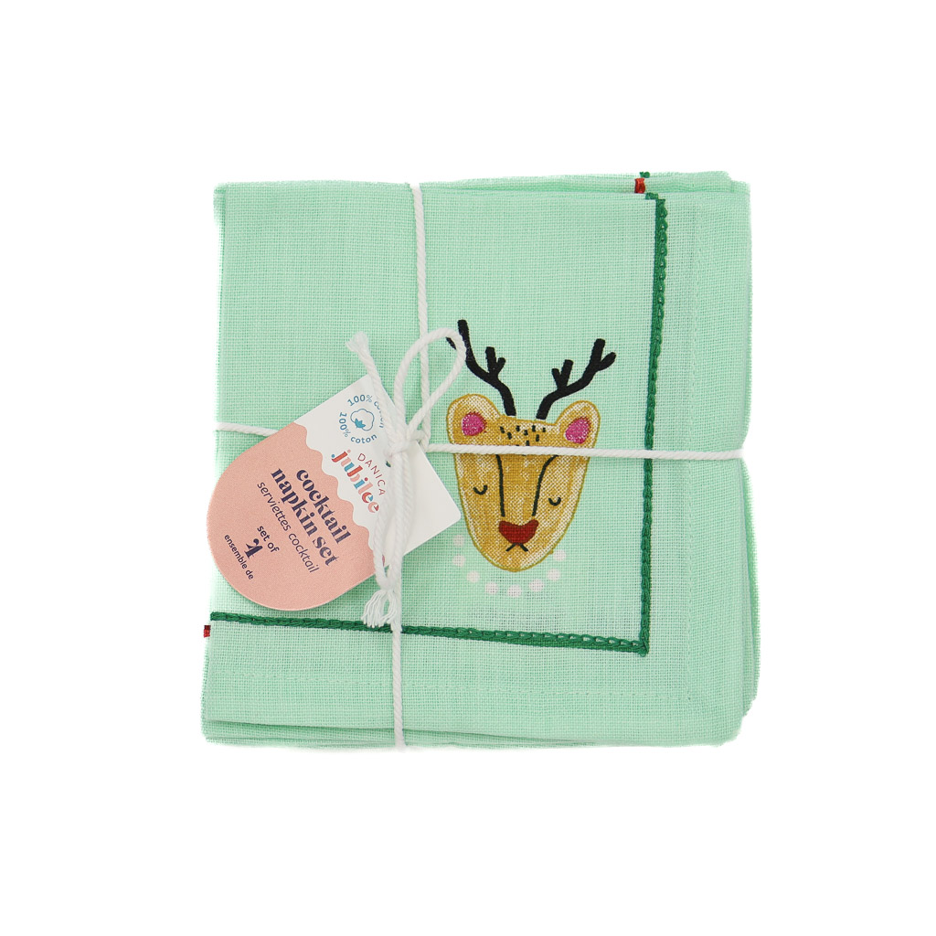 Light green in colour, these cocktail napkins feature a badger, a bear, a zebra, and a cheetah dressed up to look like Rudolph Imposters when he leads Santa’s sleigh.