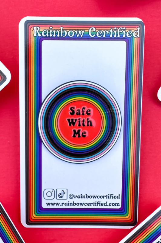 Show off your PRIDE as well as creating a safe space for others with this super cute Safe With Me Pin by Rainbow Certified !