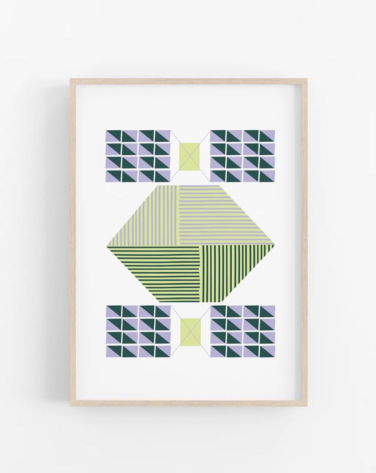 A zig-zag modern satellite for dreaming about the moon, or Jupiter! In lavender, deep green, pale yellow and a hit of modern black.