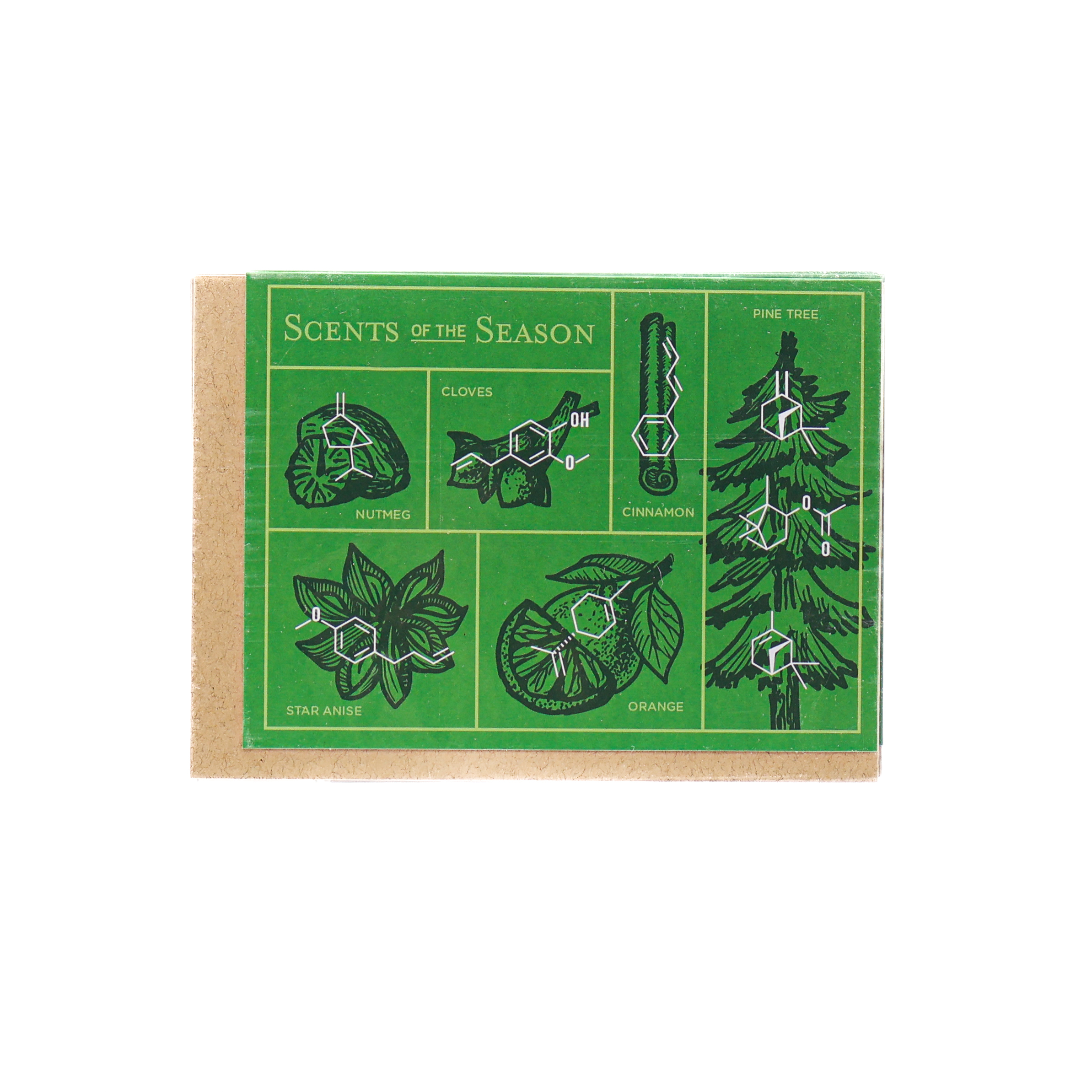 Apart from bringing back a flood of fond memories of baking pies with your mom, mulled cider on cold nights, or twinkling lights on fresh trees, the scents we associate with this festive season can be attributed to a few key aromatic molecules. This holiday greeting card pays tribute to the chemistry of the smells that are reminiscent of the holidays.