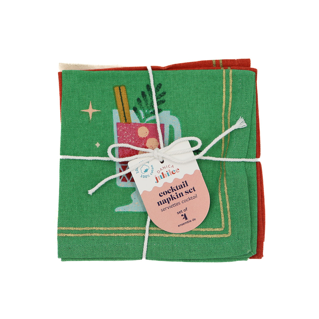 Bright green in colour, these cocktail napkins feature a pattern of spirit bottles to give your table that festive pop this holiday season!