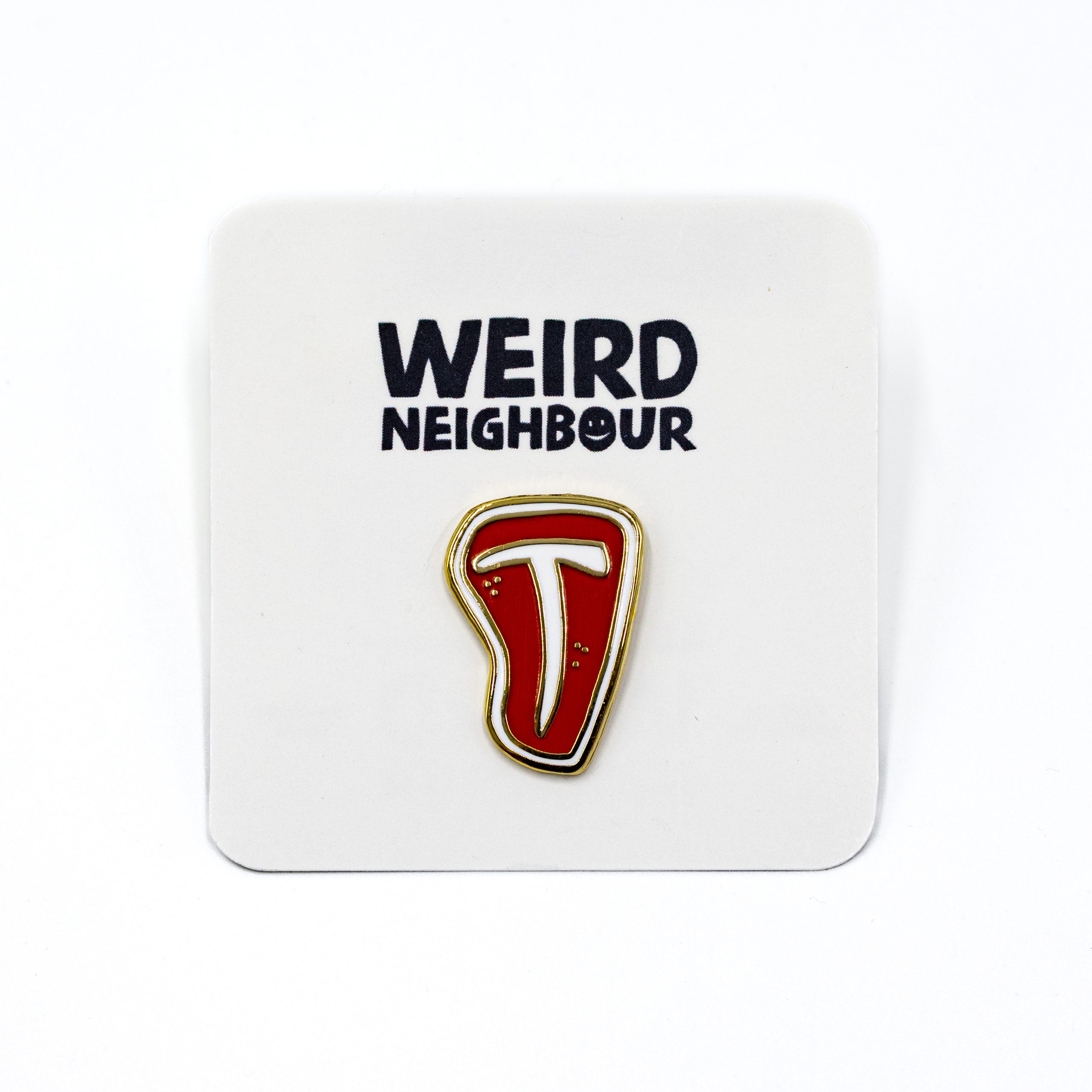 This pin is gold plated and filled with red enamel, it has a rubber backing and measures 1 inch.