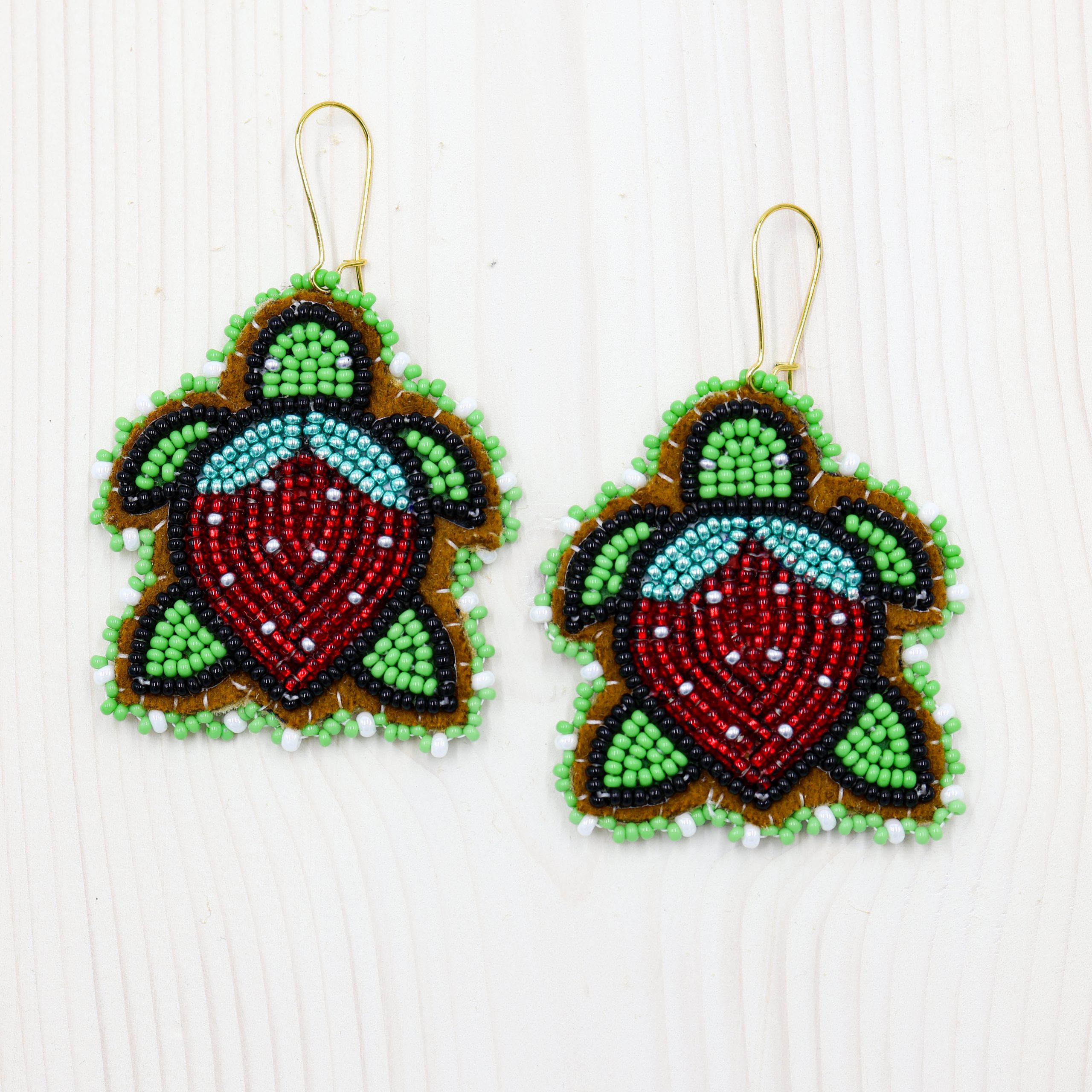 Beautifully hand beaded Turtle Strawberry Earrings by Minnie Vittrekwa.