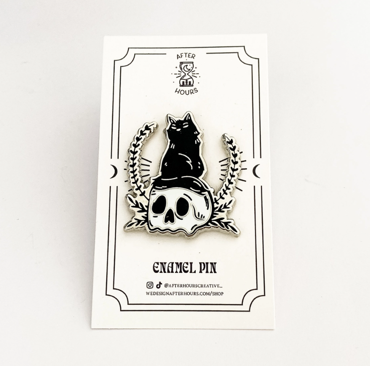Superstitious black cat sat on a skull hard enamel pin created by Toronto based vendor After Hours Creative.