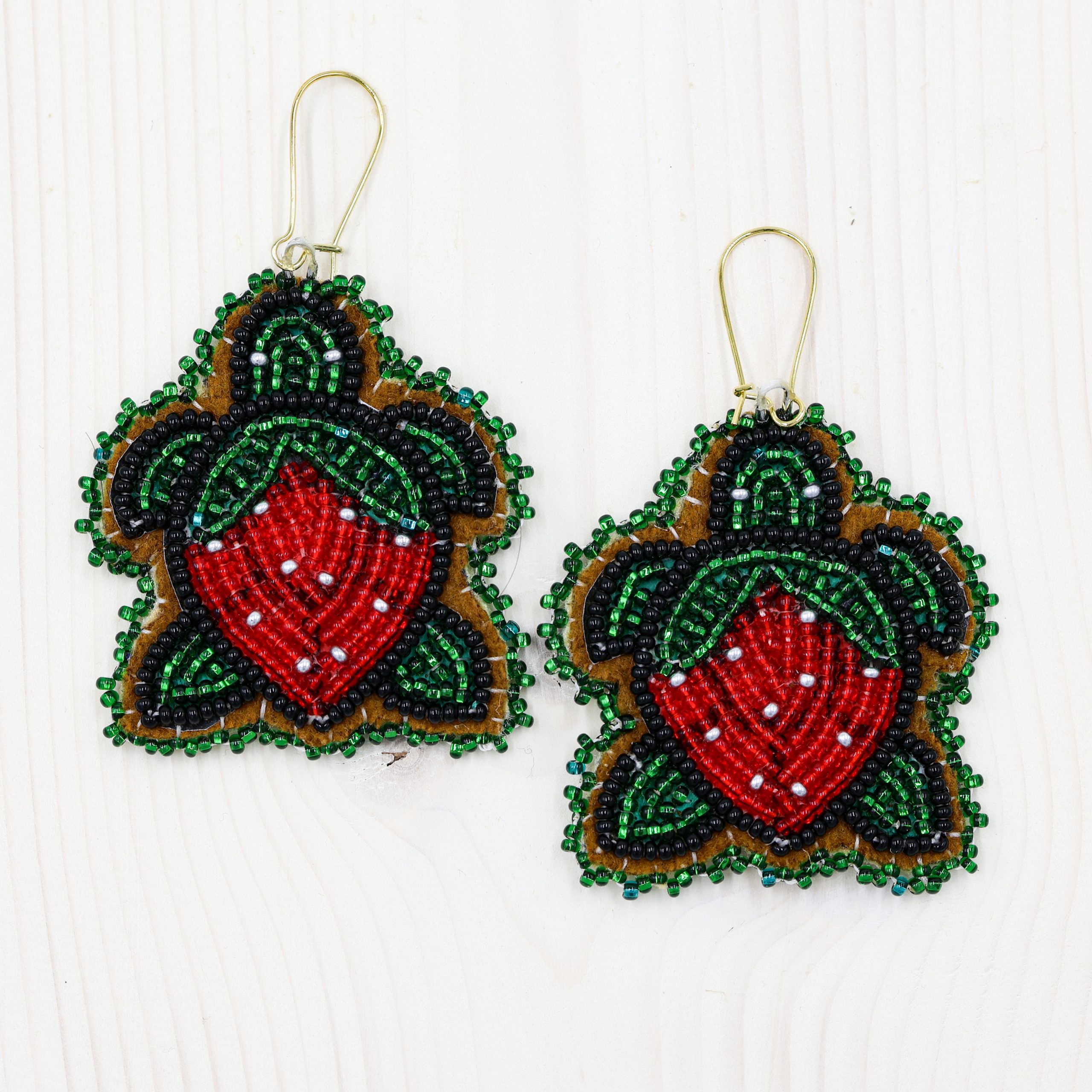 Beautifully hand beaded Turtle Strawberry Earrings by Minnie Vittrekwa.