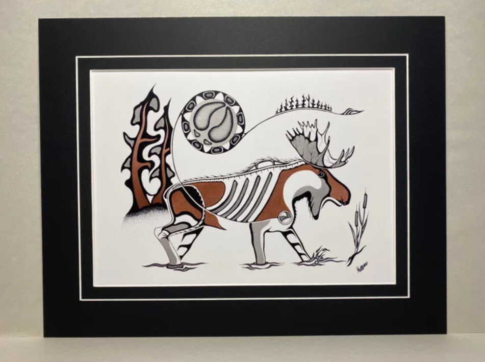 Rejuvenation ensures that the Circle of Life continues on all of Mother Earth. This piece represents this theme by depicting the moose – “moozo” to the Anishinaabek – during the time of his peak fertility in the month of September. It is at that time that the cyclic procreative impulse of Creation manifests itself in Moose, who will often traverse great distances through the forests in search of the union that will bring a new generation the following spring. This interplay between male and female is further rendered here by the connection of the feminine moon to the masculine (bull) moose. In the drawing, one can see the “energy” of this sacred time in the moon (represented by the large moose track) being sent down through Moose, connecting to his four-chambered heart.