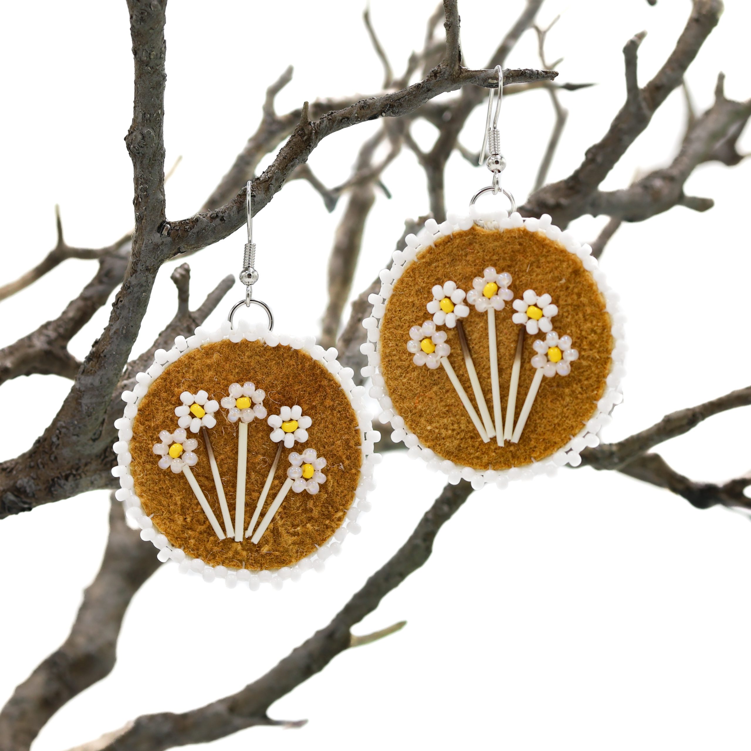 These earrings are composed of moose hide and porcupine quills, they are designed and created by Tanya Rushton.