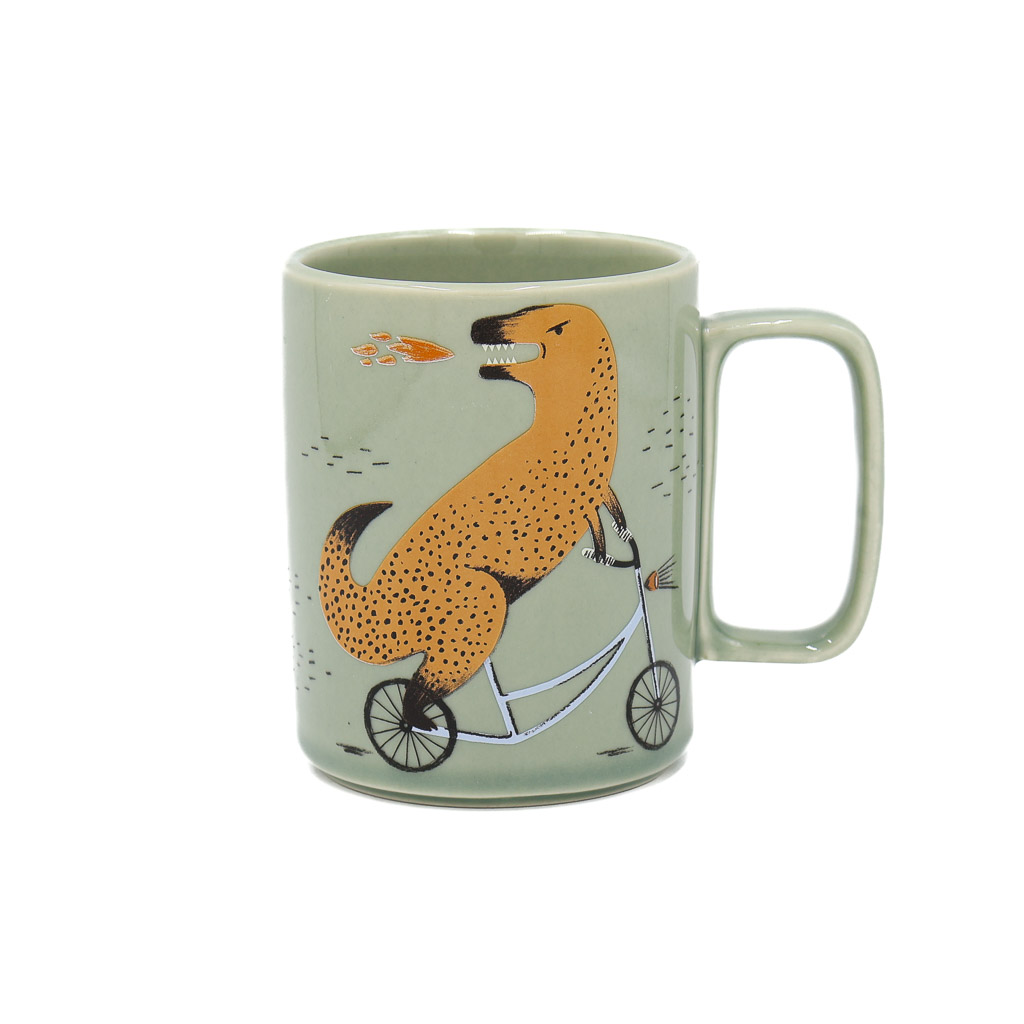 This modern mug features a unique rectangular handle and a tyrannosaurus riding a bicycle on one side with a rabbit riding a bicycle on the other.