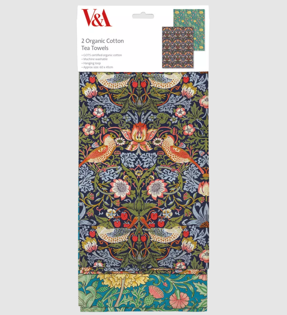 A set of two lovely tea towels, made from organic cotton with a hanging loop for ease of use. The gorgeous designs have been adapted from original wallpaper designs by William Morris, with abstract patterns of flowers and leaves on contrasting backgrounds.